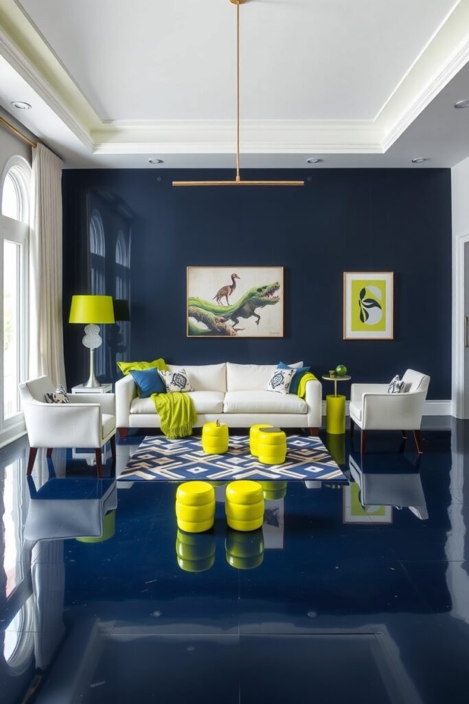 Imagine walking on navy-stained wooden floors, so dark it feels like you’re stepping on ocean water. Then bam you drop lime green throw pillows and small stools around the room like glowing jellyfish. The clash is bold but strangely cheerful.