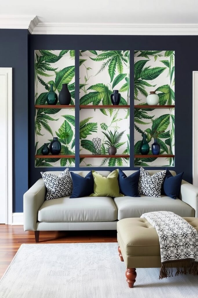 Instead of painting every wall, carve niches into your navy living room walls and line them with botanical wallpaper. Big tropical leaves, fern silhouettes, even hand-painted vines. Suddenly the wall itself feels alive, layered like a jungle corner.
