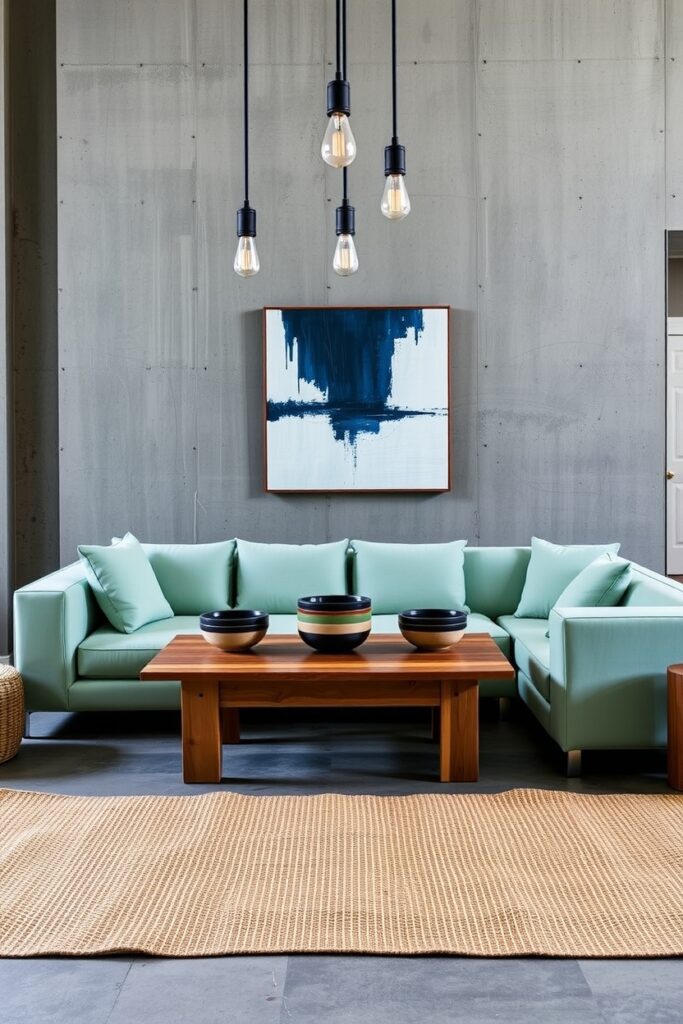 Concrete doesn’t have to look industrial gray. Navy-tinted concrete walls give the same tough vibe but in richer tones. Against that, mint-green sofas drop like fresh sorbet into the space cool, smooth, unexpected.