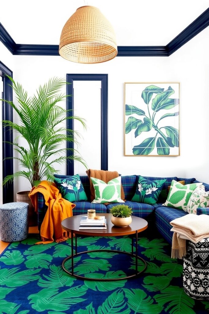 Patterns love to fight sometimes. Try navy plaid armchairs mixed with jungle-green printed cushions or even palm-leaf curtains. It’s deliberate chaos but somehow lands in harmony.
