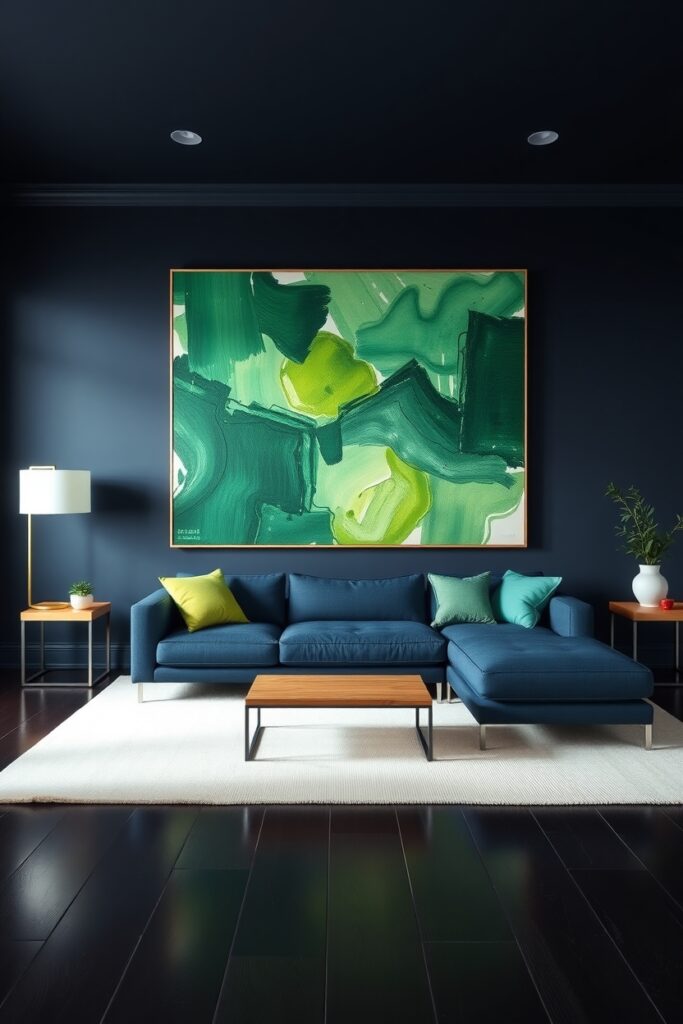 Go ridiculously big. A single oversized green canvas or abstract artwork hung on a navy wall takes over the room in one move. The contrast is cinematic, like a spotlight has been left on permanently.