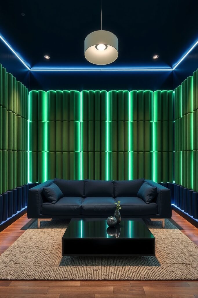 Acoustic panels are usually boring, but cover them in mossy green fabric and suddenly they double as wall art. Then wash them in angled navy lighting from hidden LEDs. The room feels hushed, almost cinematic, while the colors play off each other.