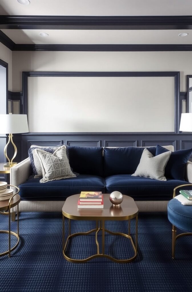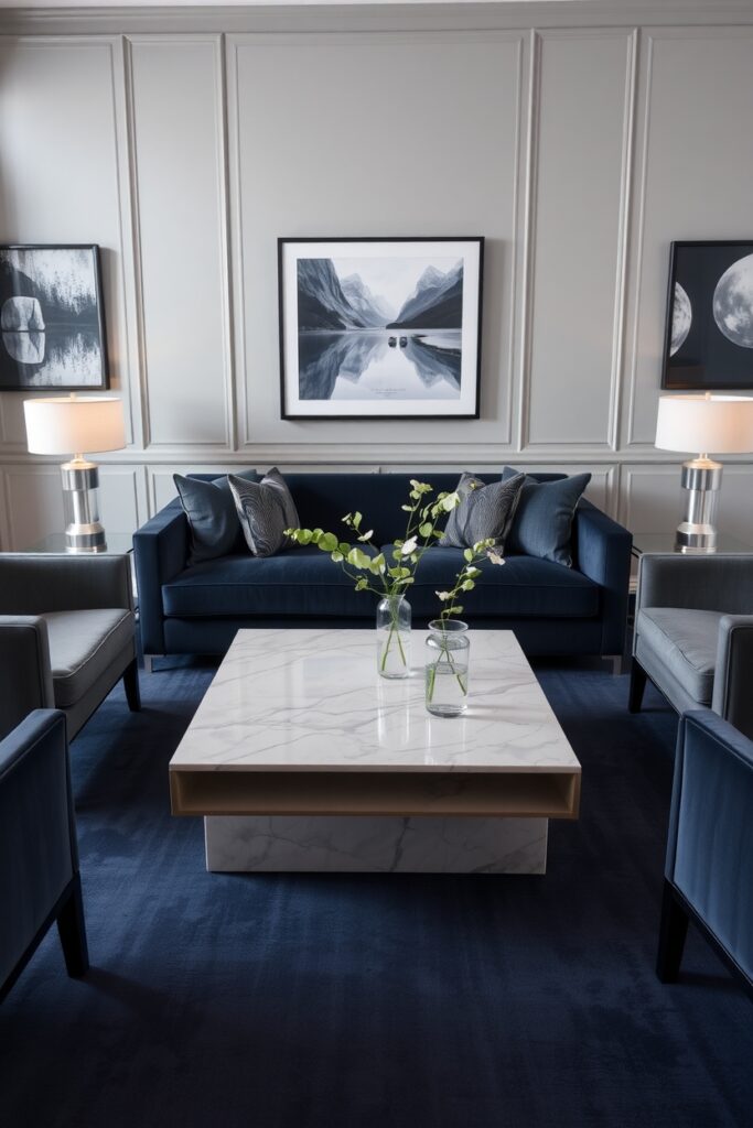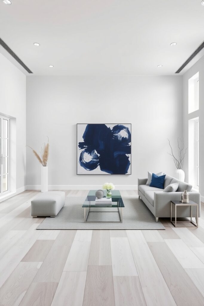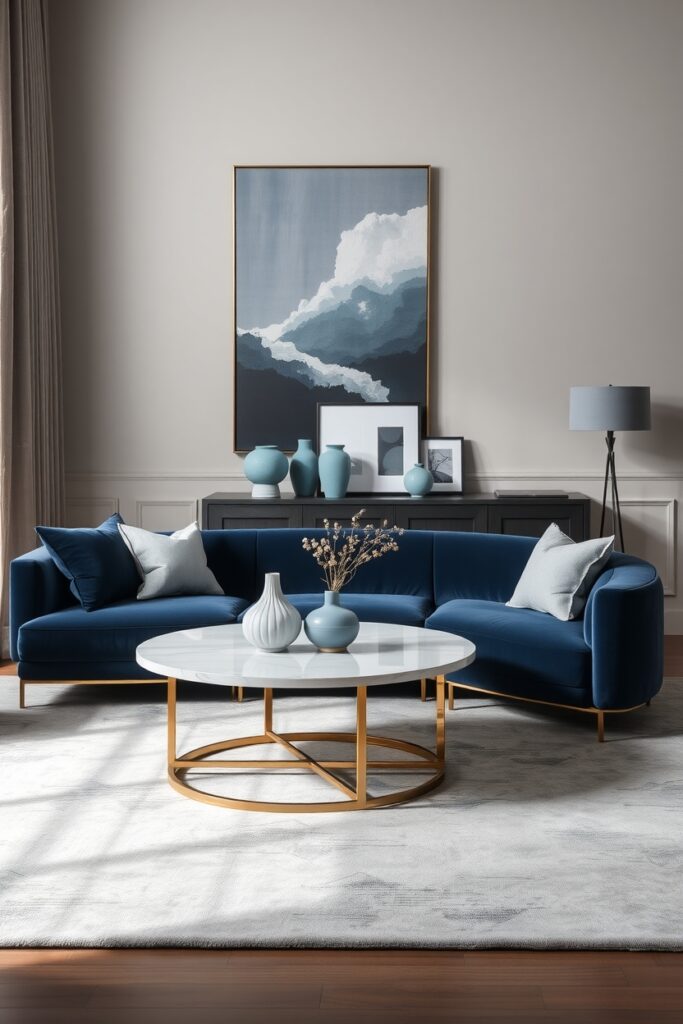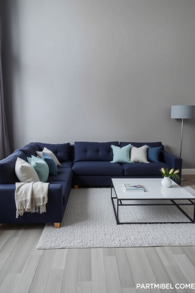 Sometimes the boldest move is restraint. Keep your walls, sofa, and rug all in light grey tones. Then hang one large navy-dominant art piece a painting, print, or textile art that commands the entire space.