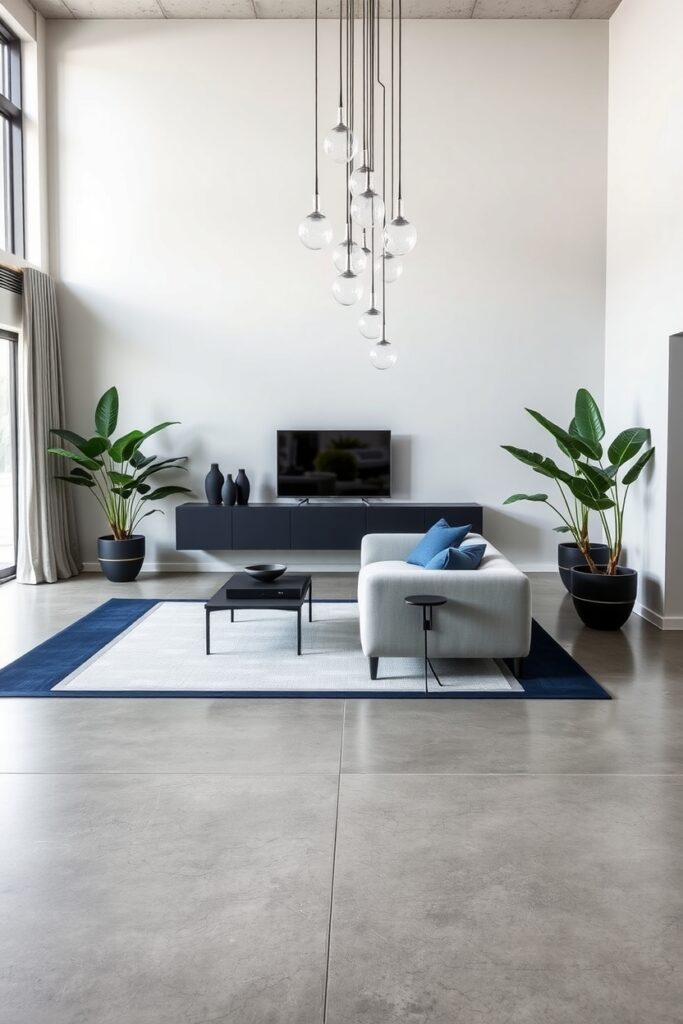 Bare floors can feel cold, but when done right industrial, grounded, totally 2025. If you’ve got polished grey concrete, soften it up with navy rugs that define “zones.”