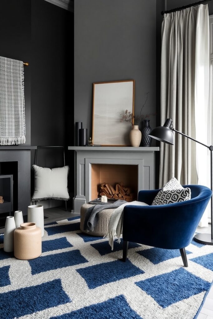 A navy geometric rug under the sofa area, maybe another under the reading nook it’s like creating little color islands. And the contrast? Magic. It makes the greys look more deliberate, less construction-site.