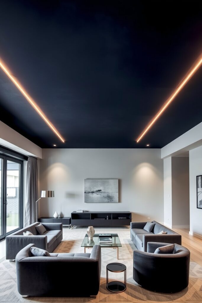 A navy ceiling with recessed lighting and soft textiles below feels like future design done right unexpected but serene.