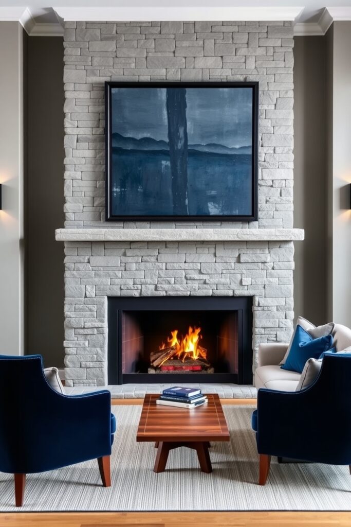 11. Grey Stone Fireplace With Navy Framed Art Above