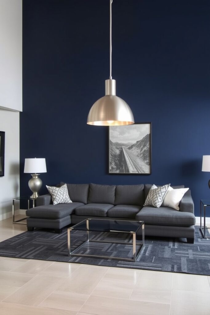 13. Brushed Steel Lighting Against Navy Accent Wall