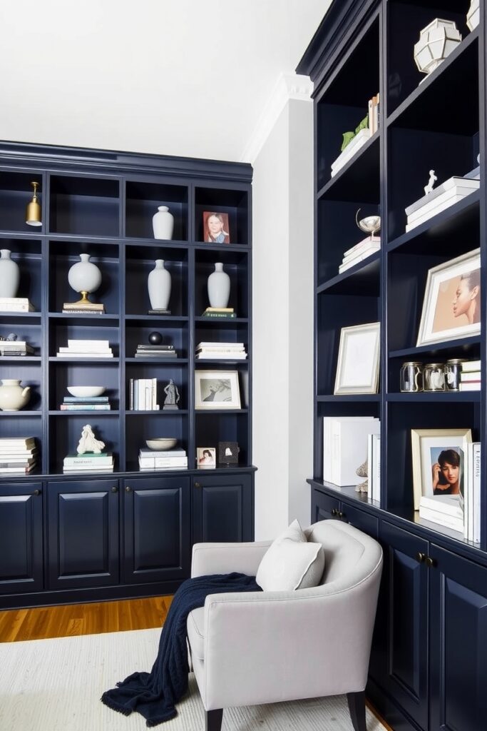 14. Navy Built-In Bookshelves With Grey Decor Pieces