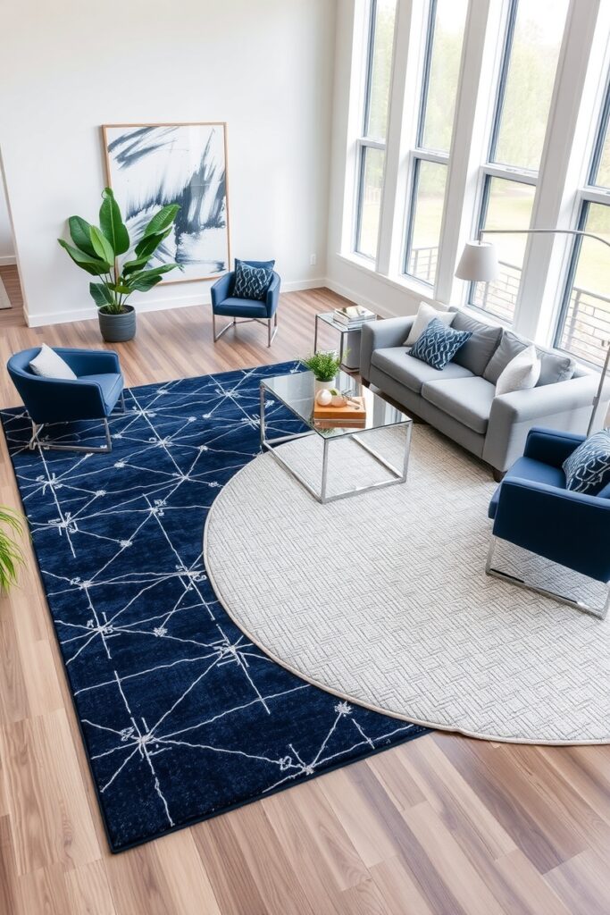 Double rugs, double texture. Lay a smaller navy rug over a large pale grey one it instantly adds depth and coziness. Especially great for open-plan living rooms that need visual grounding.