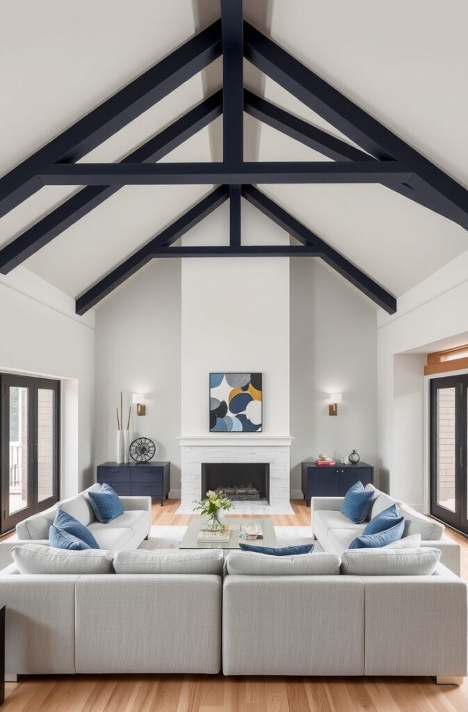 Keep the rest of the room airy with soft greys and whites. When sunlight hits those beams, they’ll look like bold brushstrokes across the sky. A subtle architectural drama.