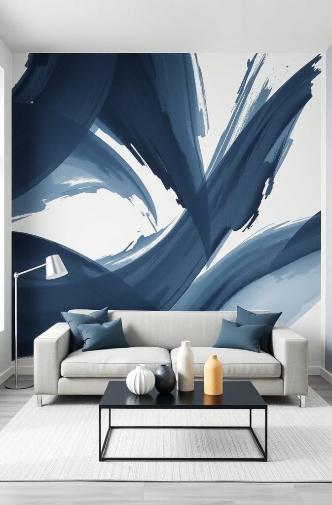 19. Minimalist Grey Sofa With Navy Abstract Wall Mural