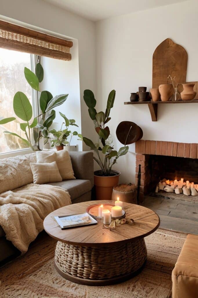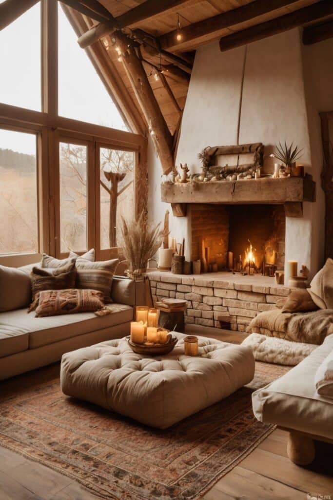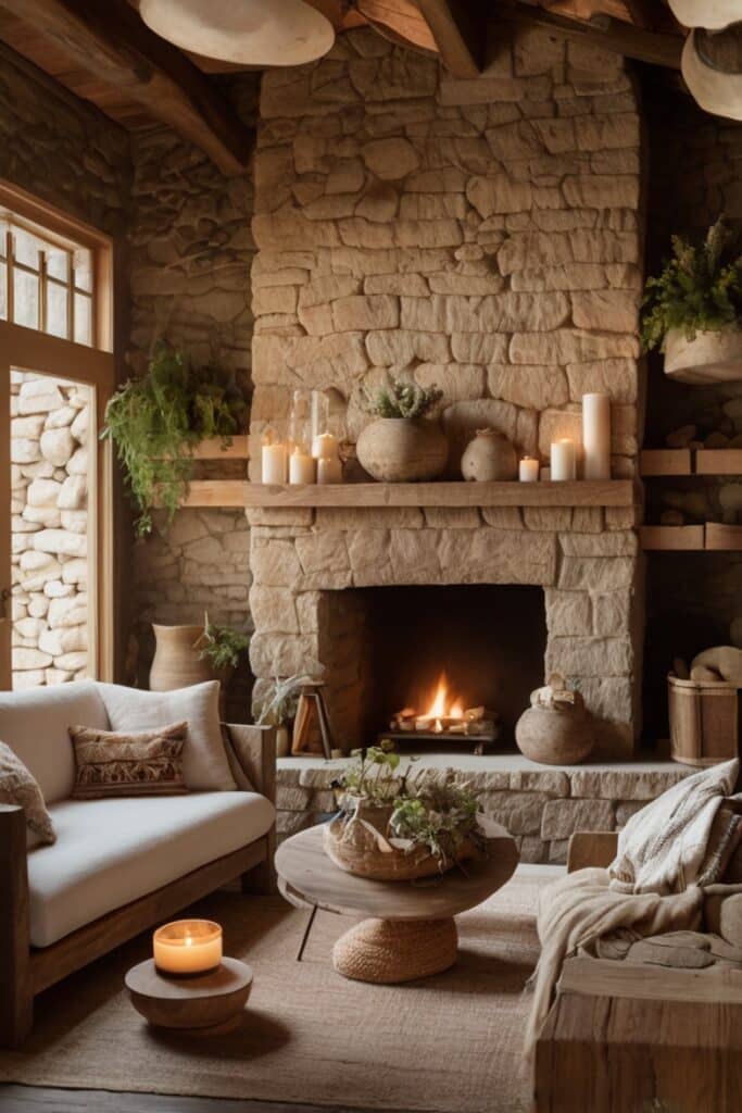 Not everyone has a working fireplace. Doesn’t matter. Rustic boho says: use it anyway. A fireplace, even when it’s just a hollow nook, still becomes the soul of the room. You just have to get creative.