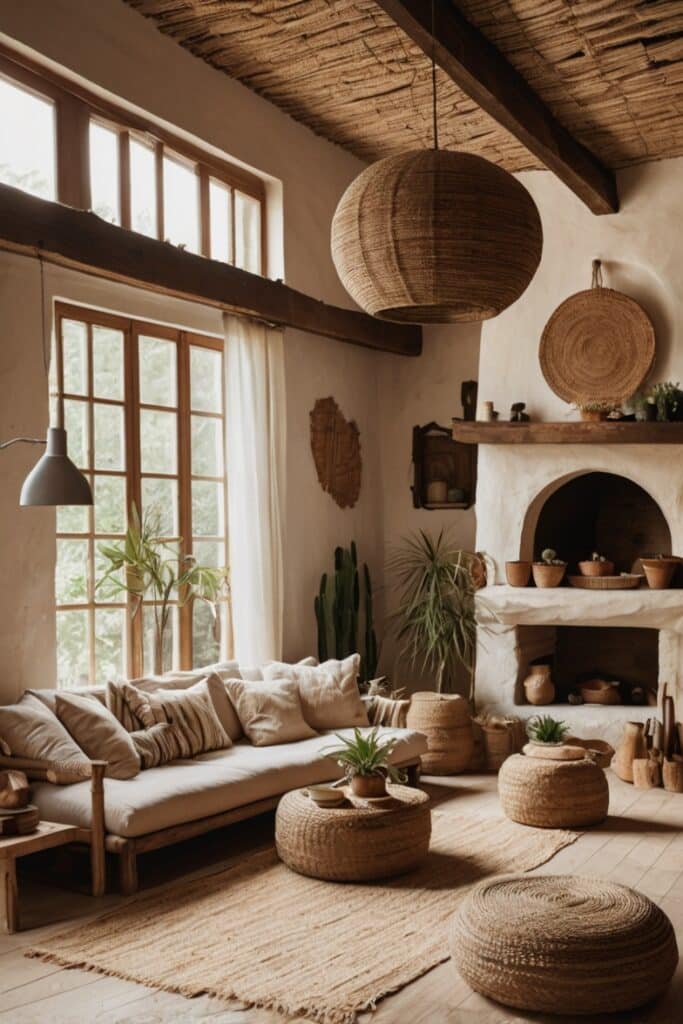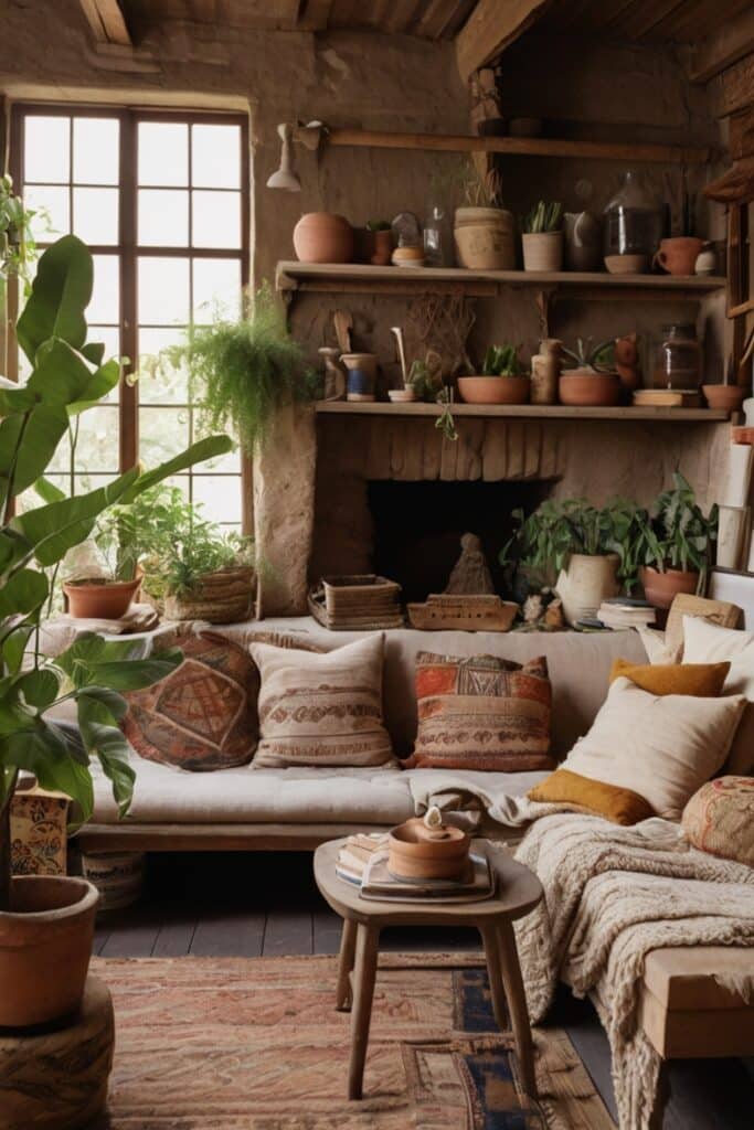 The goal isn’t fire. It’s warmth. A fireplace becomes the beating heart of rustic boho living even when the flames are long gone.