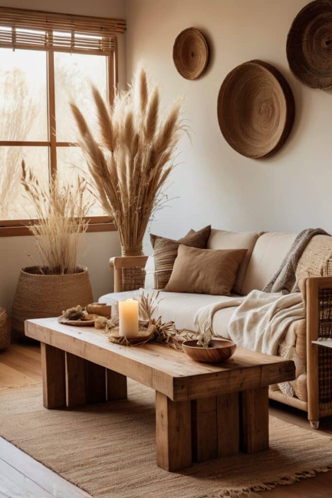Wood in rustic boho isn’t just “brown table, brown chair.” In 2025, people are leaning towards mixed, unpolished woods. A driftwood coffee table with uneven legs? Yes please. A walnut bookshelf that looks like it’s seen three decades of moves? Even better.