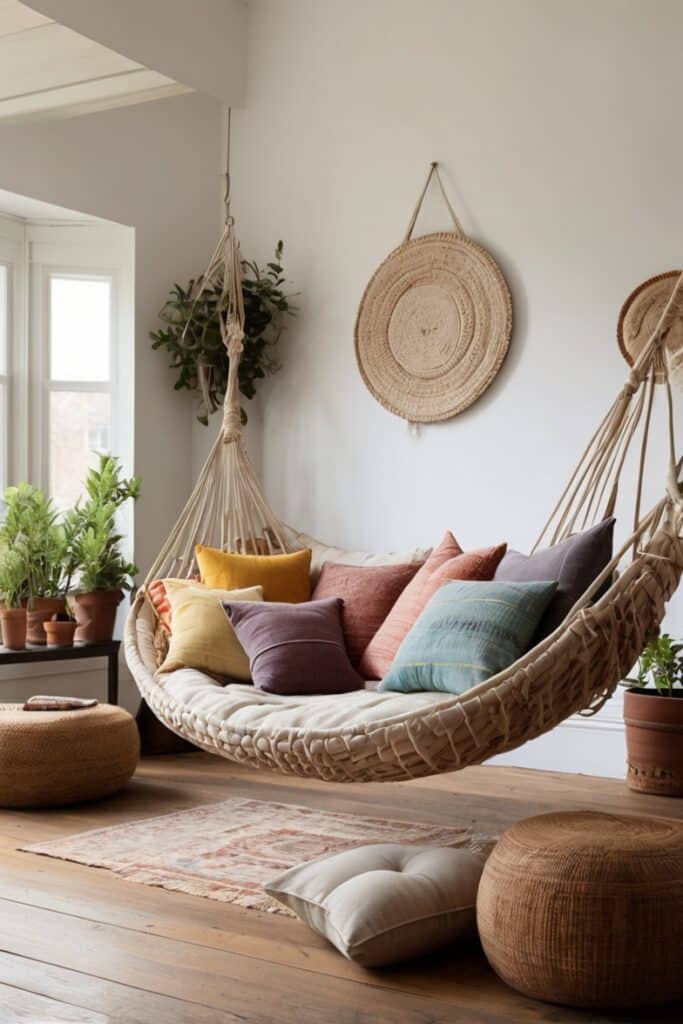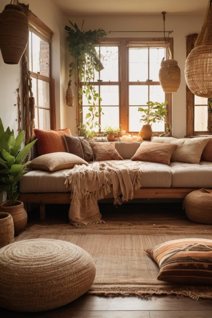 The rustic boho living room isn’t about stiff sofas where you sit politely. It’s about sprawling. In 2025, low seating is having a big moment. Think poufs, oversized floor pillows, daybeds with thick cushions, even hammocks if you’re daring.