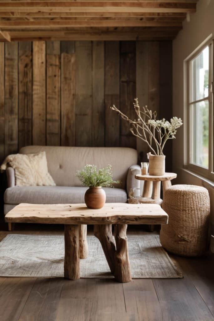What makes it work is contrast. Rough cedar planks against sleek plaster walls. A gnarly tree stump stool next to a woven pouf. The whole room becomes alive when wood feels found instead of bought.