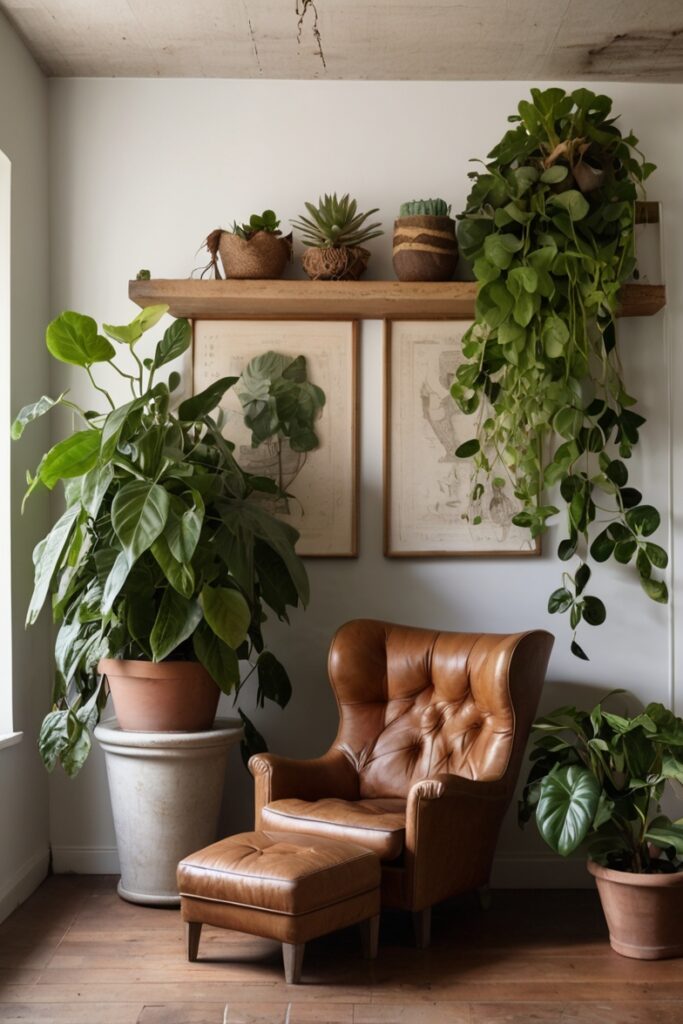 Put plants in surprising spots too. On top of cabinets, hanging from rough branches, even crowding near the fireplace. The “too many plants” look is actually the look.