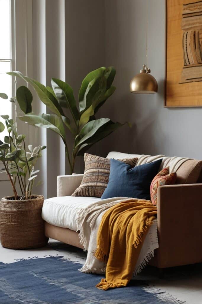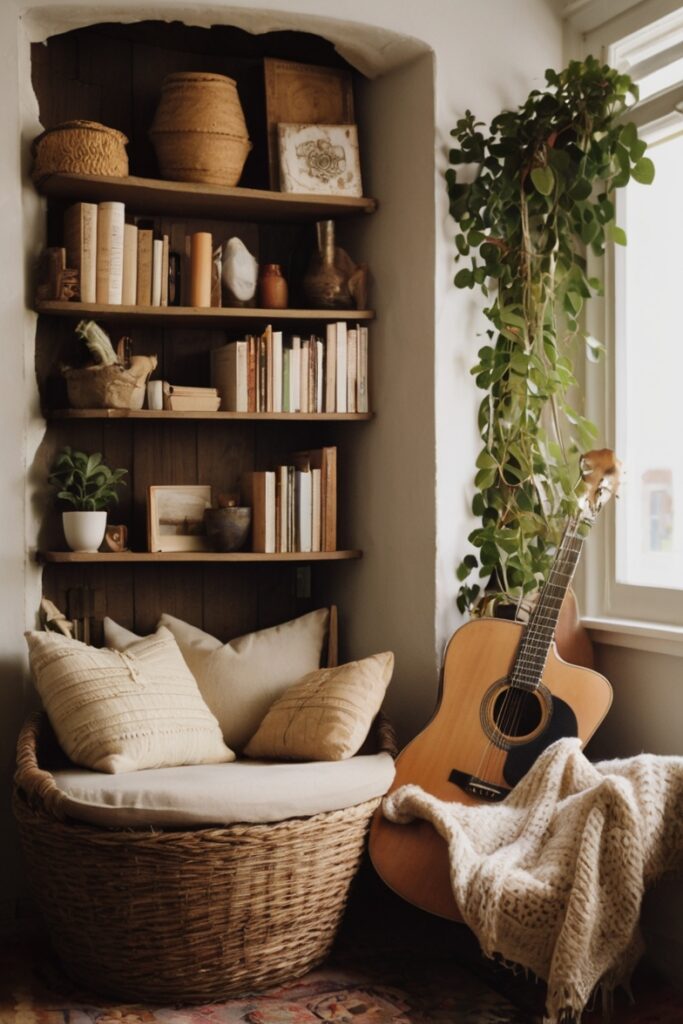 Every boho living room in 2025 has one thing: a corner that’s not about the TV. Rustic boho is about slowing down, so carve out a nook. Throw a worn armchair by the window with a knitted throw, add a basket of books, maybe a guitar leaning nearby.