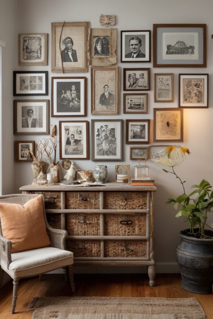 Rustic boho doesn’t stick to one big statement piece of art. It thrives on collages of random things that somehow belong together. Old black-and-white photos in cracked frames. Handmade weavings. A child’s sketch pinned next to a vintage map.