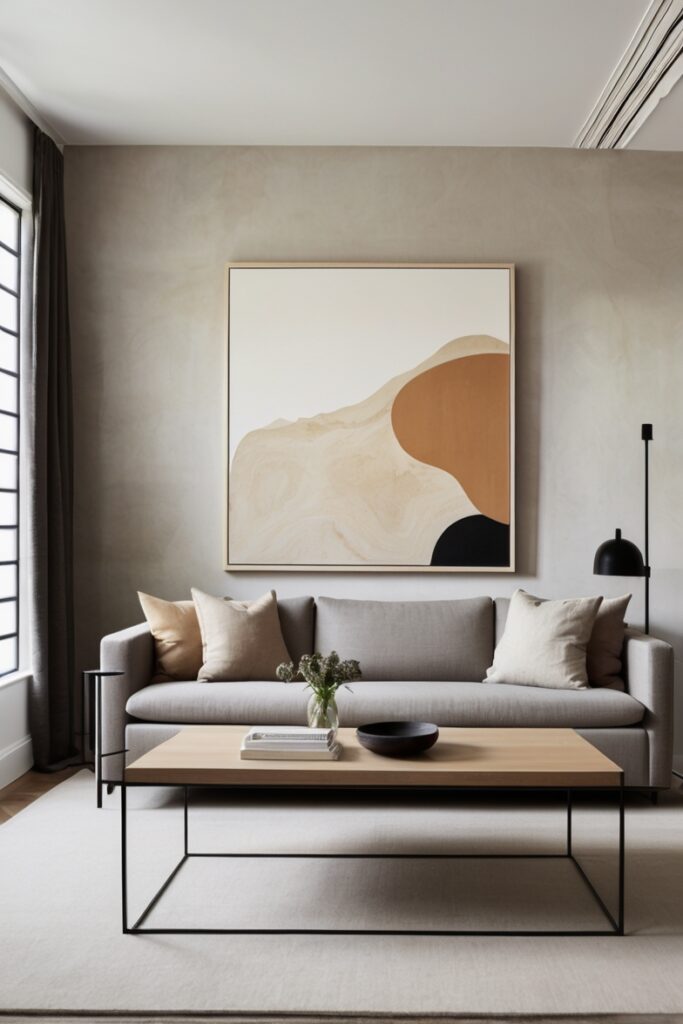 White walls return here, but not sterile ones they’re textured, slightly chalky, alive. A single abstract painting, maybe with raw brushstrokes or monochrome splatters, pulls the whole space into focus. Everything else furniture, decor whispers around it.