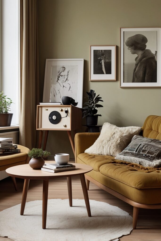 Retro made a comeback, but in a gentle, nostalgic way. Instead of cold modern pieces, the 2025 Scandinavian living room often reaches back to the 60s and 70s for warmth. Think teak sideboards, amber glass lamps, corduroy cushions. It’s grandma-chic, but elevated.