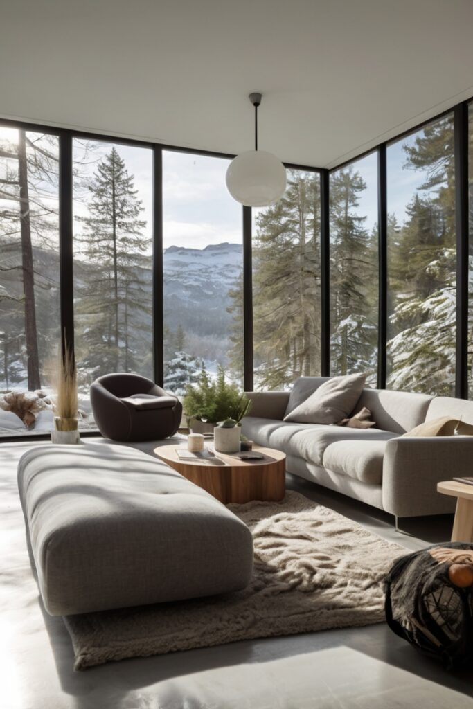Imagine snowflakes brushing against glass while you sit wrapped in wool. Or a birch forest framed like artwork behind your sofa. The architecture becomes scenery.