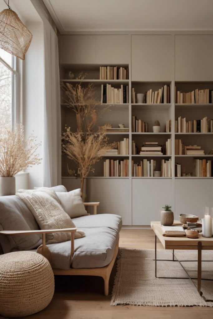The Scandinavian living room, reimagined as a reading sanctuary. Shelves built into every available inch, books organized by tone rather than title, and soft armchairs that swallow you whole.