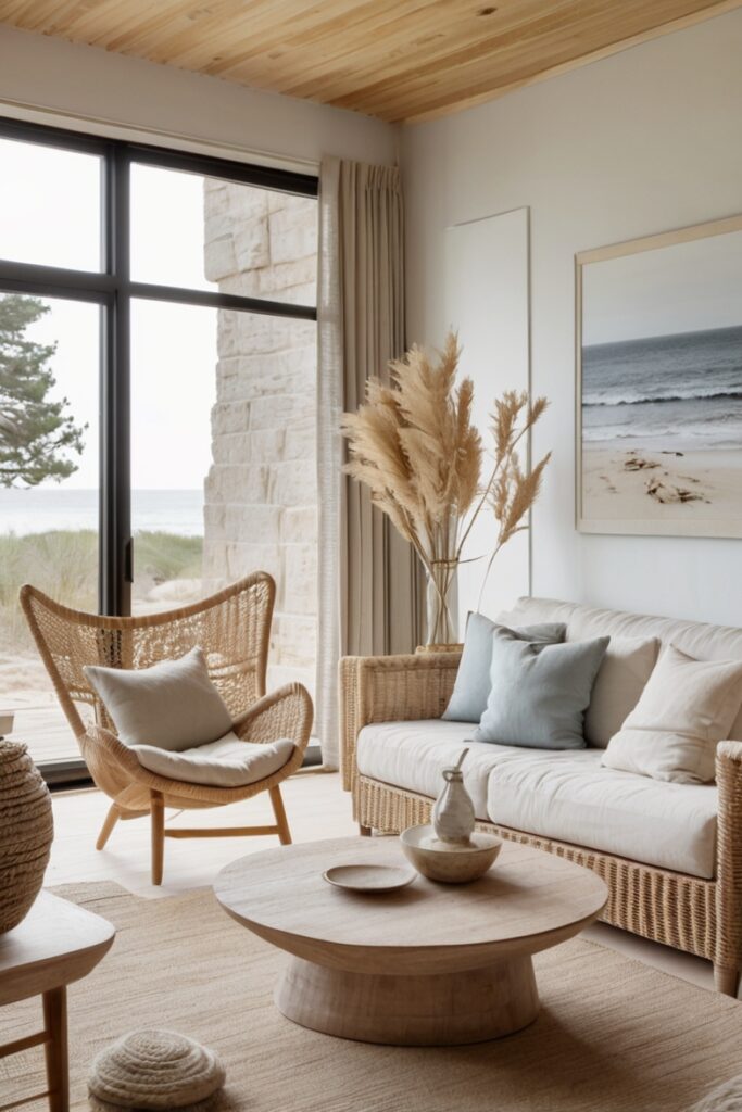 Textures feel sun-bleached and relaxed canvas sofas, stone vases, rope baskets. Everything whispers rather than speaks. You can almost hear seagulls and gentle waves through the hush.