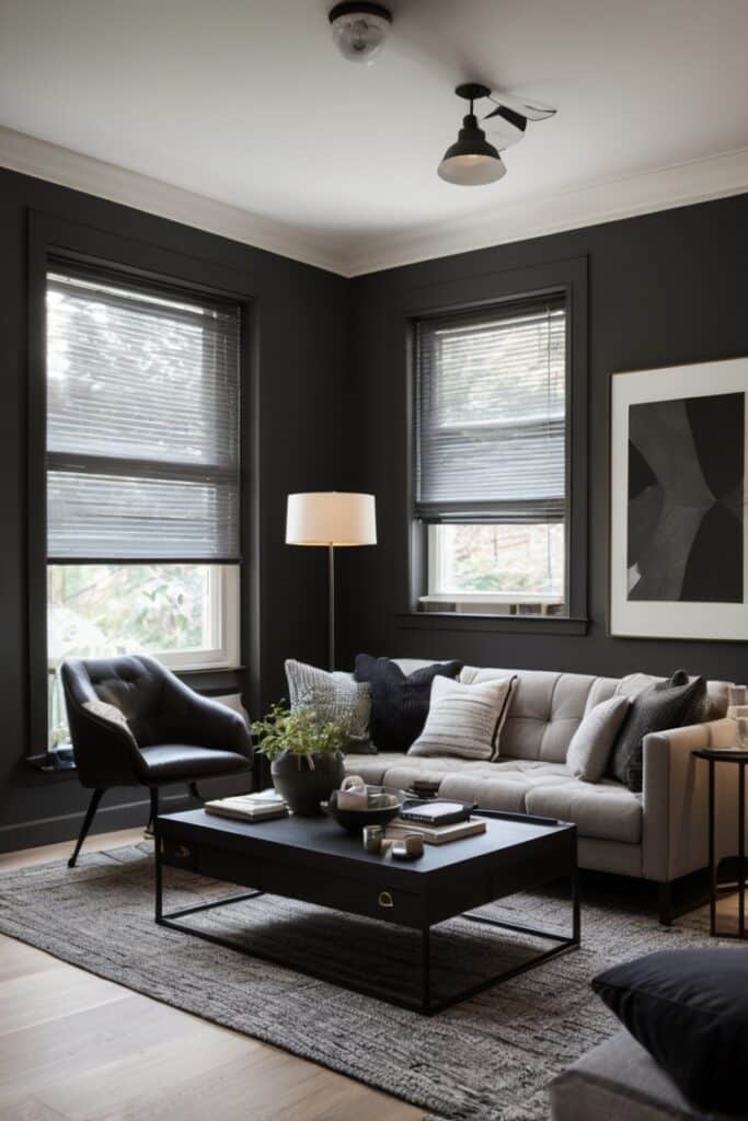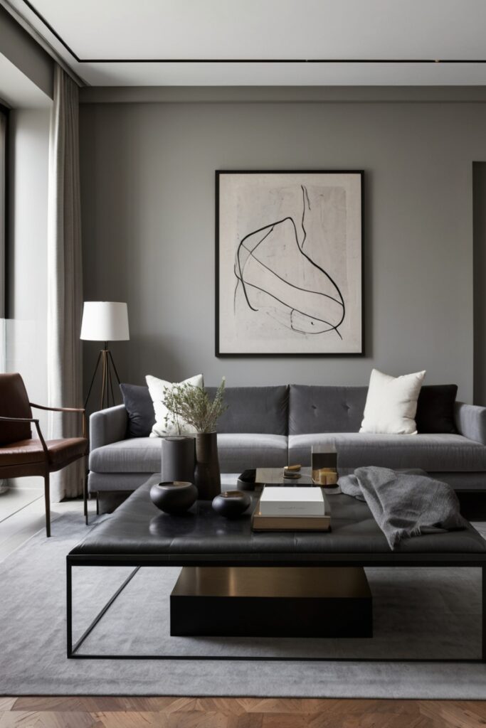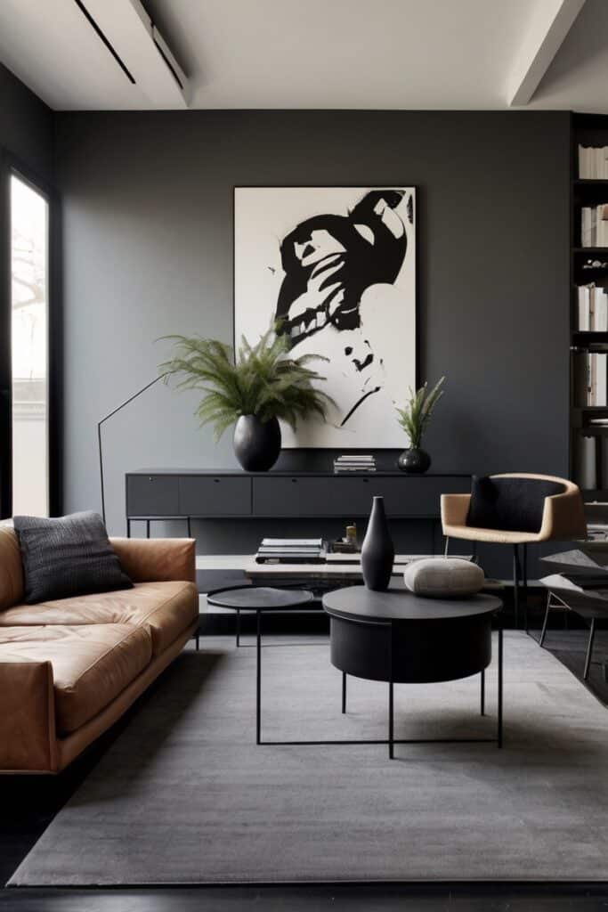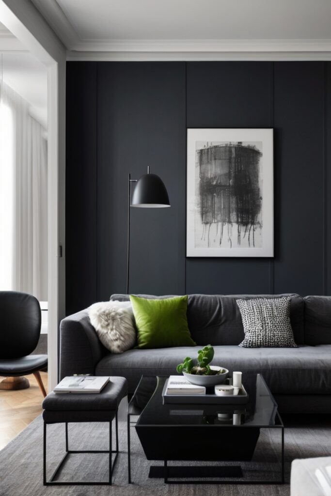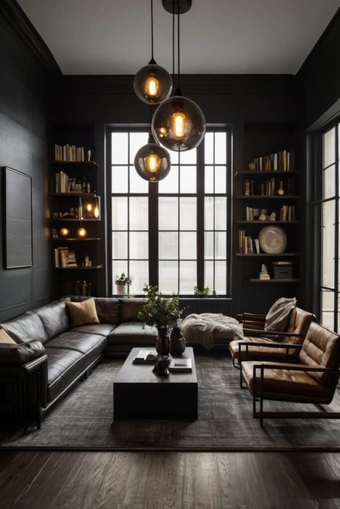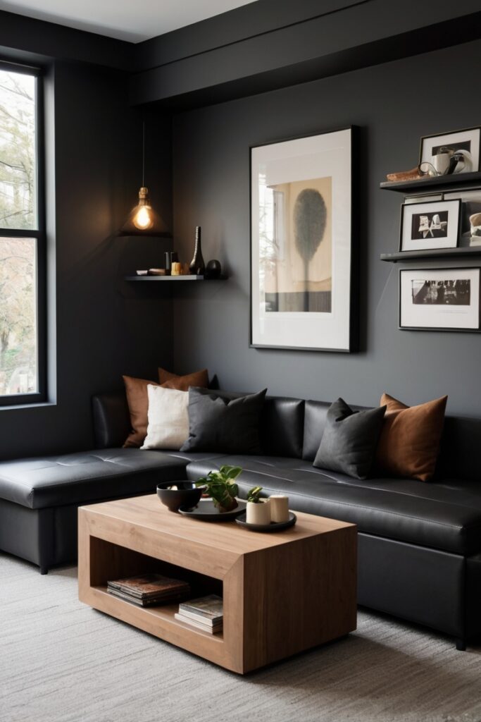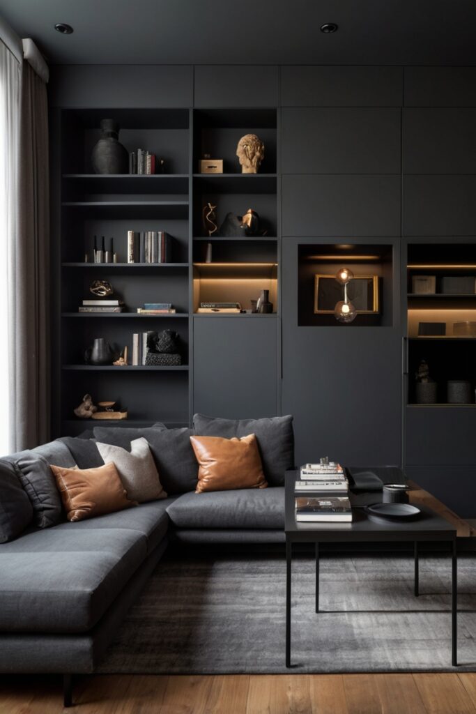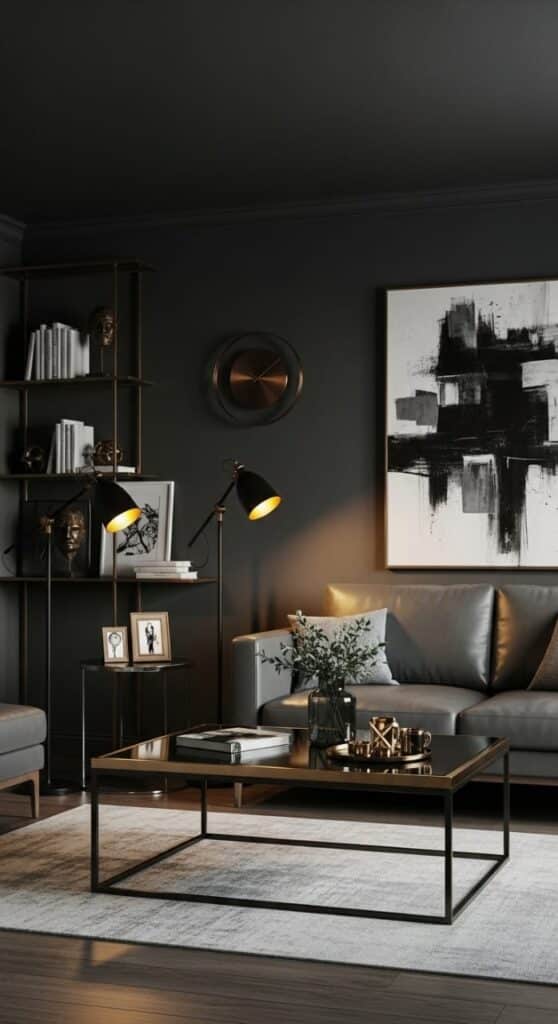 Here’s the play: choose one base color gray, black, navy, or even dark green. Keep everything in that spectrum, walls to rug. Then break the whole seriousness with a single bold pop: a blood-red ottoman, an amber glass lamp, or a mustard throw.