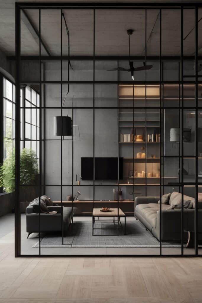 Forget closing off your living room with heavy walls. Glass partitions framed in black metal create zones without killing space. They add grit and a masculine architectural punch while keeping light flowing through the room.