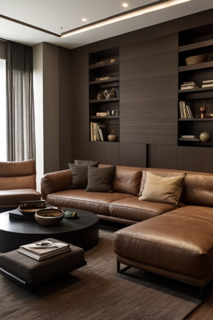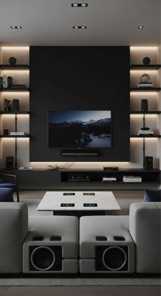 Masculine living rooms are no longer screaming with big black screens mounted like trophies. In 2025, the modern man is hiding tech seamlessly. Slim soundbars blend into wall panels, TVs rotate into cabinetry, lighting adjusts by voice with almost invisible fixtures.