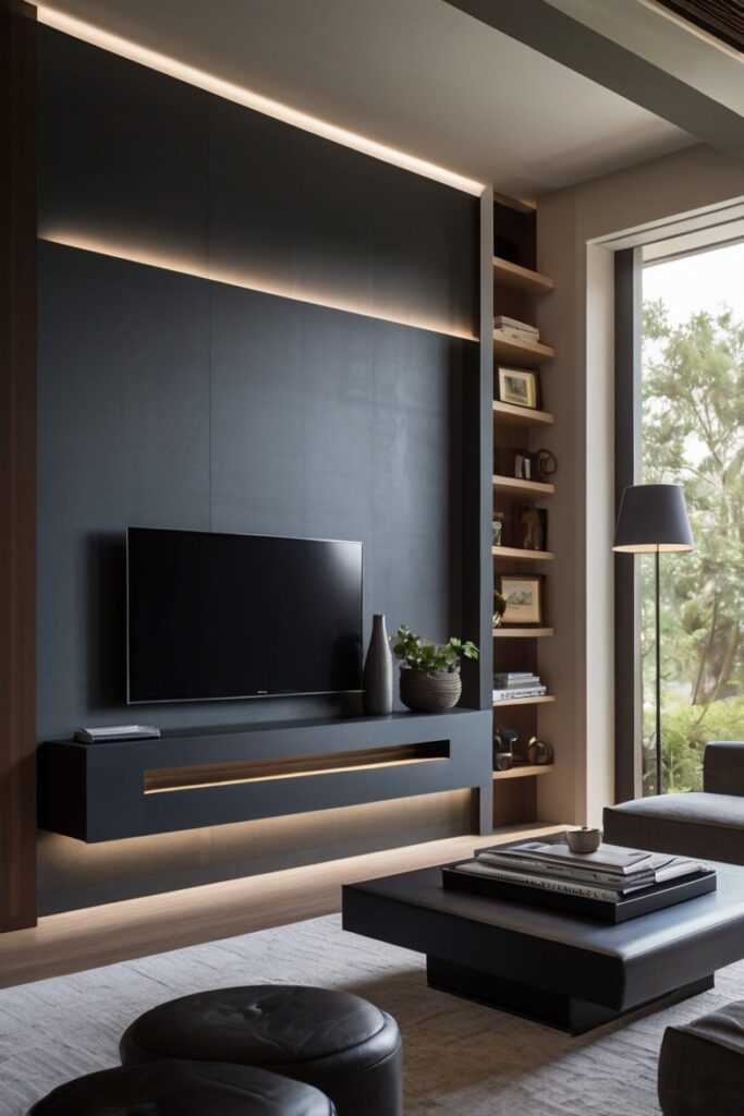Big entertainment units eat too much space. Floating media consoles mounted directly on the wall keep the floor clear, making the room look bigger. A slim matte cabinet in walnut or black becomes both storage and centerpiece.