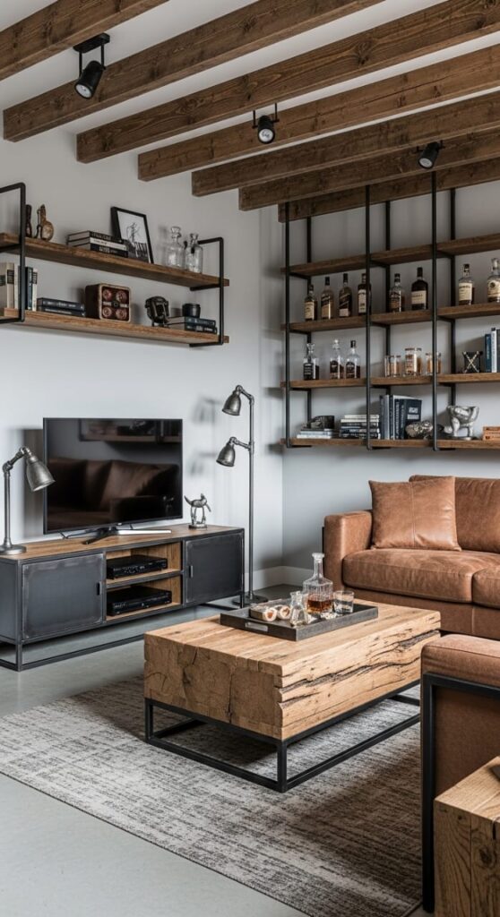 Small masculine living rooms need walls to pull double duty. Floor-to-ceiling shelving in dark wood or matte black transforms a blank wall into functional art. Store books, whiskey bottles, or even sculptural objects without wasting floor space.
