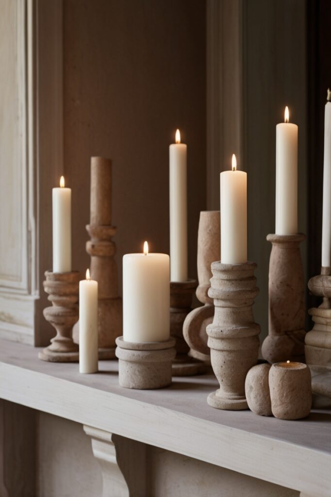 Stone, plaster, raw wood, or ceramic candle holders steal attention quietly.