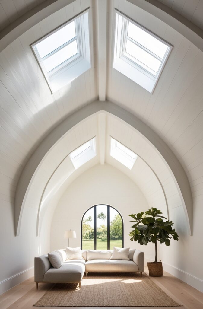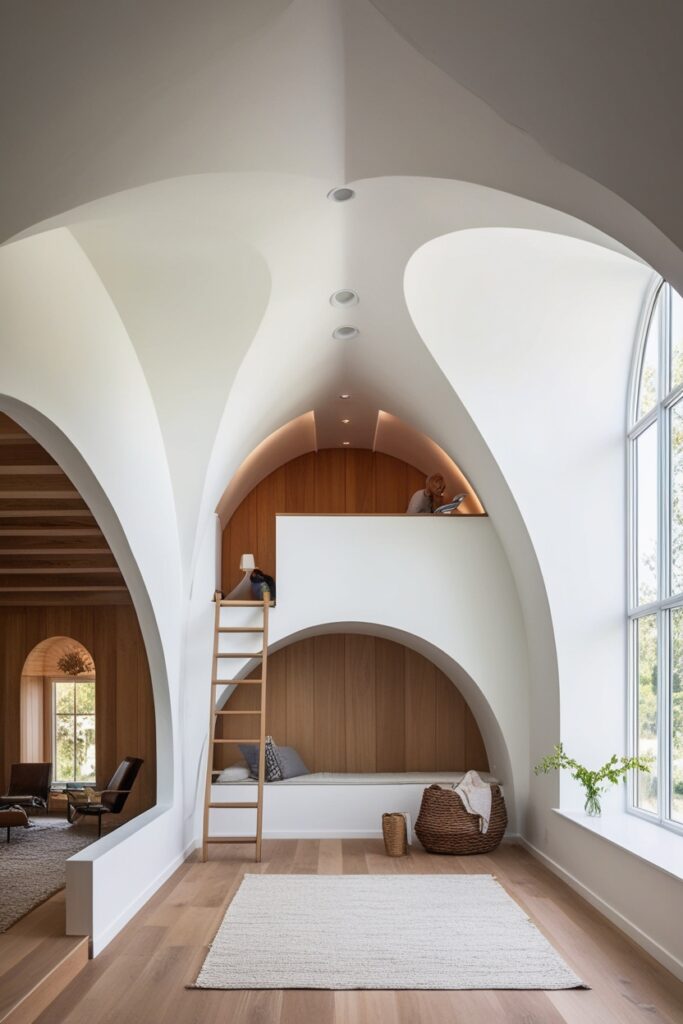 Here’s something clever. Some modern homes with vaulted ceilings are carving small loft spaces right into the curve. Not full floors just little tucked-in reading lofts, accessible by a slim ladder or floating staircase.