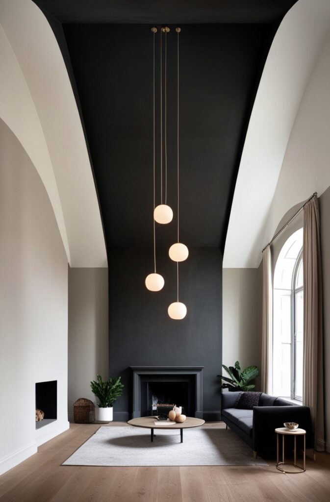 3. Dramatic Charcoal Ceilings with Low-Hanging Pendants