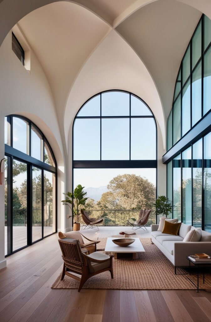 Imagine standing in a space where the ceiling arches high and then melts into a wall of glass that frames trees, city lights, or distant mountains. It’s like the room itself decided to exhale.