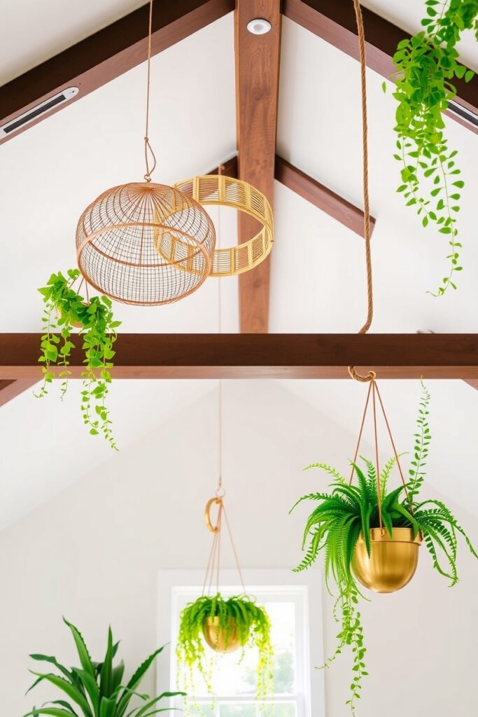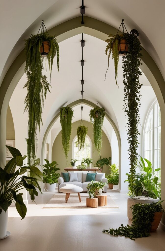 This idea sounds odd until you see it. Instead of chandeliers, some designers in 2025 are hanging lush trailing plants ferns, philodendrons, even cascading ivy from discreet ceiling hooks beneath the vault.