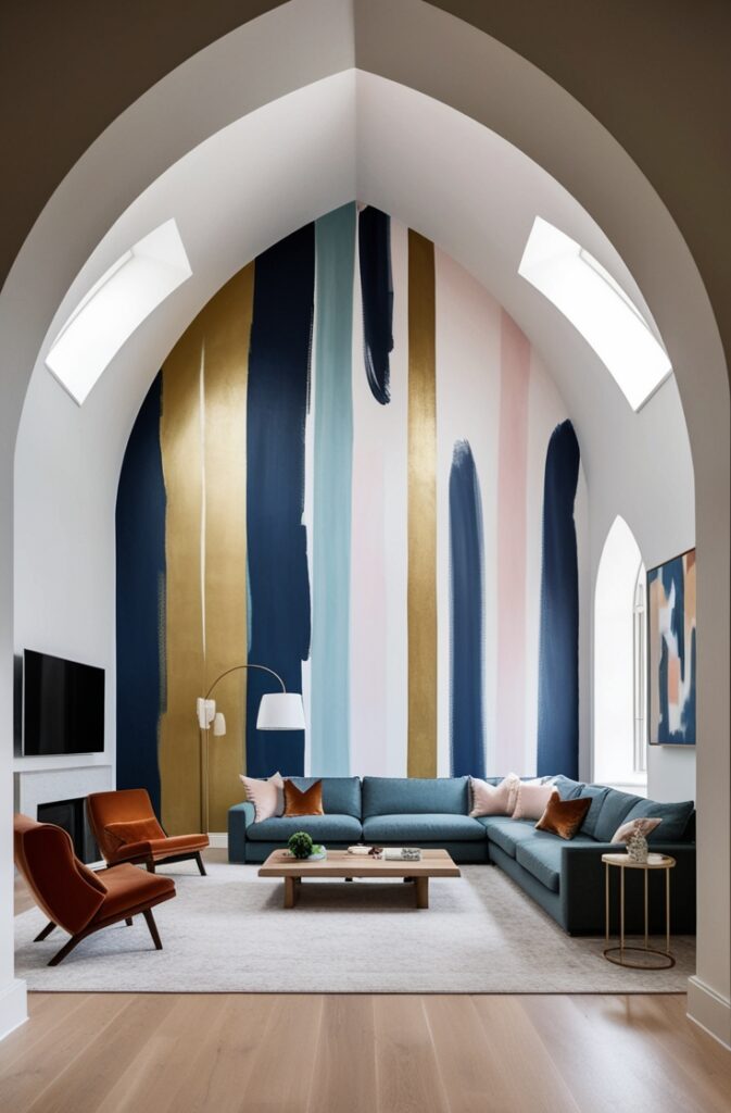 Picture a living room with a 14-foot mural of abstract strokes climbing the wall, disappearing into the vaulted peak. It doesn’t have to be loud; even soft, dreamy gradients work. The mural acts like a visual ramp, carrying your eyes up toward the ceiling’s highest point.