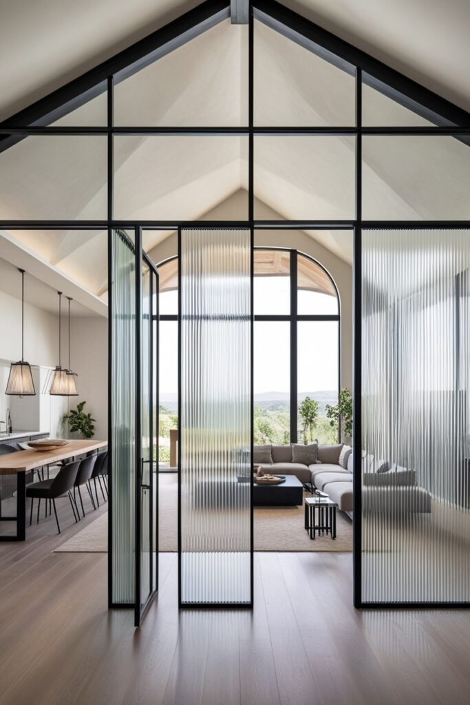 So, designers in 2025 are slicing spaces with interior glass partitions black metal frames, frosted panes, or even ribbed glass for texture.
