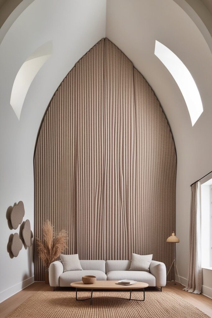 This one’s practical but unexpectedly stylish. Vaulted ceilings can sometimes make living rooms sound like airport terminals. But in 2025, acoustic treatment has turned chic.