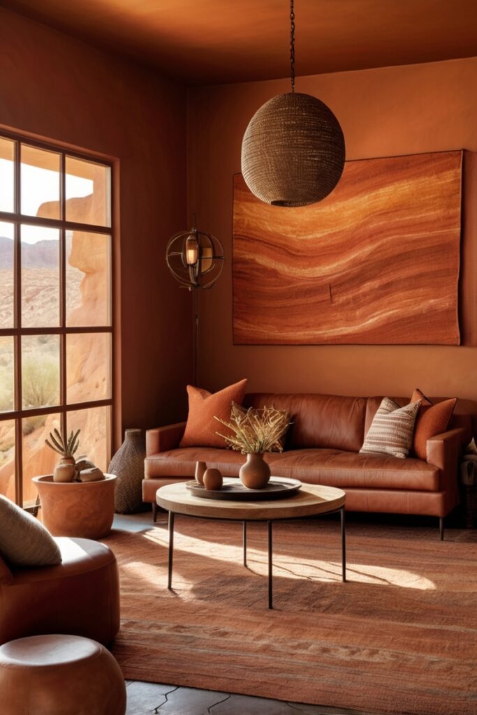 Walls in warm clay tones sunset terracotta, desert rose, dusty rust.