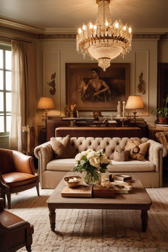Picture pale suede sofas, white plaster walls, and antique brass lamps casting slow light.