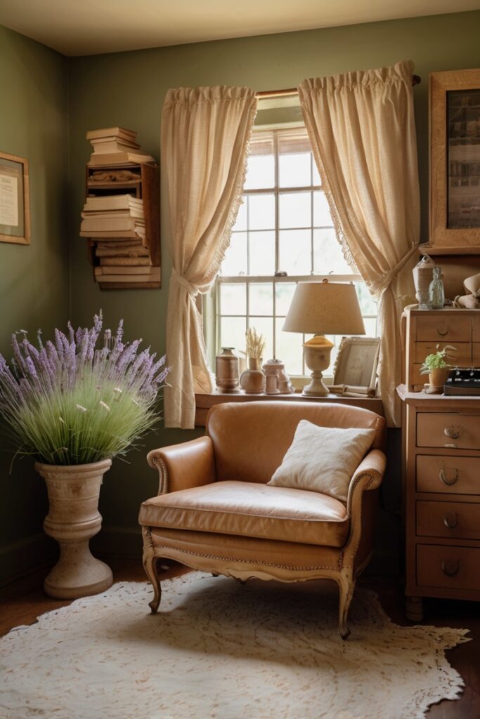 Add a chunky knit throw, a flickering lantern, and shelves filled with old glass decanters.