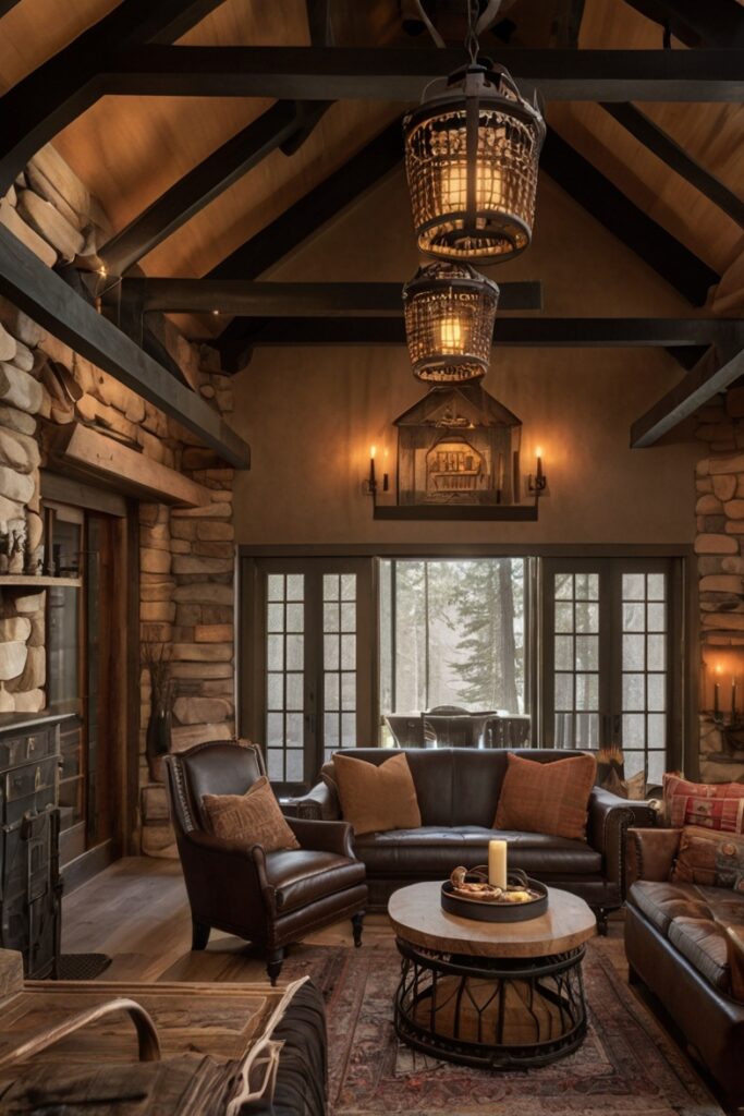 A roaring fire, plaid cushions, and iron lanterns swinging gently from hooks.